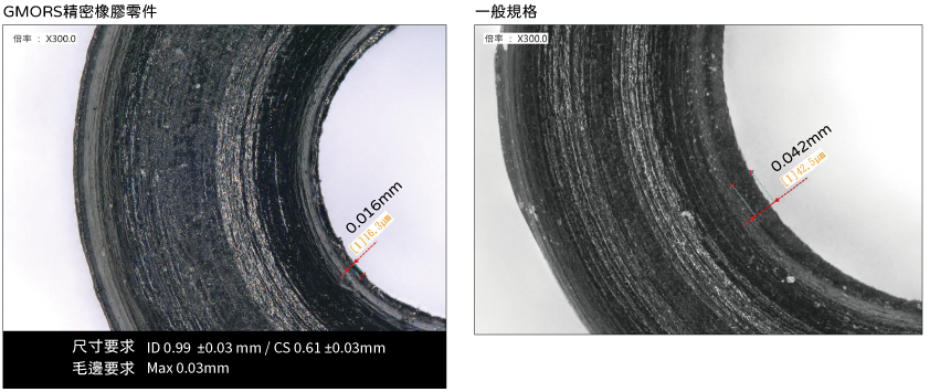 GMORS的精密O形圈技術(shù)最小量產(chǎn)尺寸可達內(nèi)徑0.50mm、線徑0.40mm,尺寸公差控制在正負0.01mm,毛邊控制在0.03mm內(nèi)的高精度水平。(圖1)